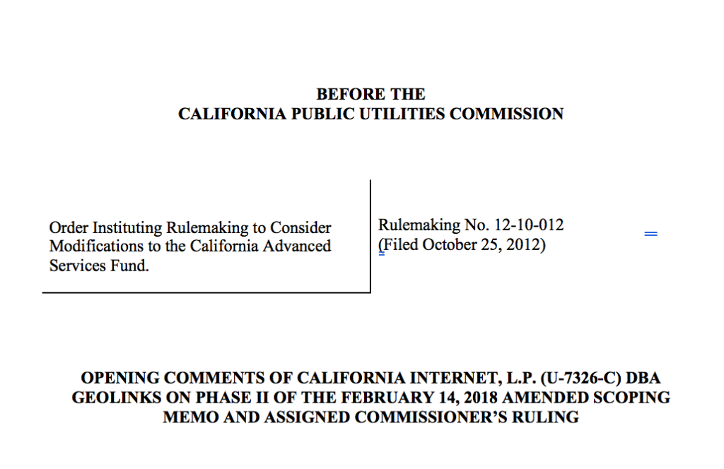 BEFORE THE CALIFORNIA PUBLIC UTILITIES COMMISSION Order Instituting Rulemaking to Consider Modifications to the California Advanced Services Fund. | Rulemaking No. 12-10-012 (Filed October 25, 2012) OPENING COMMENTS OF CALIFORNIA INTERNET, L.P. (U-7326-C) DBA GEOLINKS ON PHASE II OF THE FEBRUARY 14, 2018 AMENDED SCOPING MEMO AND ASSIGNED […]