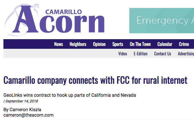 Camarillo company connects with FCC for rural internet GeoLinks wins contract to hook up parts of California and Nevada | September 14, 2018 By Cameron Kiszla cameron@theacorn.com PLUGGED IN—Skyler Ditchfield, CEO of Camarillo-based internet provider GeoLinks, is passionate about bringing high-speed access to residents in rural areas of […]