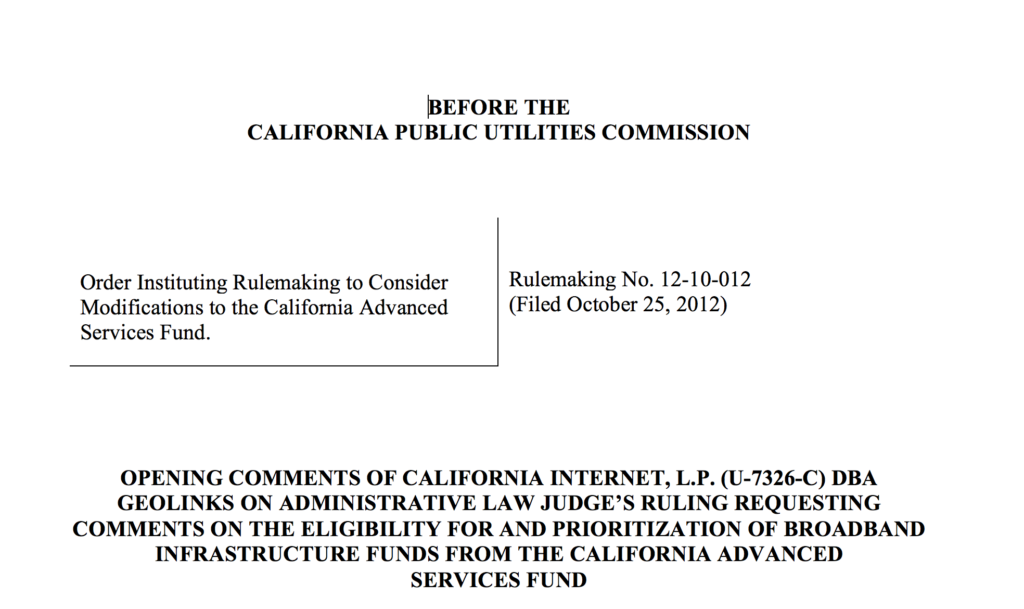 BEFORE THE CALIFORNIA PUBLIC UTILITIES COMMISSION Order Instituting Rulemaking to Consider Modifications to the California Advanced Services Fund. Rulemaking No. 12-10-012 (Filed October 25, 2012) OPENING COMMENTS OF CALIFORNIA INTERNET, L.P. (U-7326-C) DBA GEOLINKS ON ADMINISTRATIVE LAW JUDGE’S RULING REQUESTING COMMENTS ON THE ELIGIBILITY FOR AND PRIORITIZATION OF […]