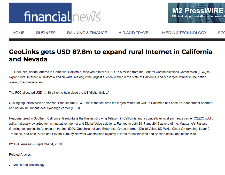 GeoLinks gets USD 87.8m to expand rural Internet in California and Nevada GeoLinks, headquartered in Camarillo, California, received a total of USD 87.8 million from the Federal Communications Commission (FCC) to expand rural Internet in California and Nevada, making it the largest auction winner in the state of […]