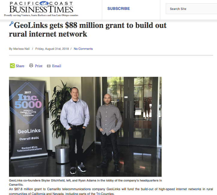 GeoLinks gets $88 million grant to build out rural internet network By Marissa Nall / Friday, August 31st, 2018 / GeoLinks co-founders Skyler Ditchfield, left, and Ryan Adams in the lobby of the company’s headquarters in Camarillo. An $87.8 million grant to Camarillo telecommunications company GeoLinks will fund […]
