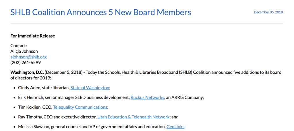 Original Source SHLB.org Washington, D.C. (December 5, 2018) – Today the Schools, Health & Libraries Broadband (SHLB) Coalition announced five additions to its board of directors for 2019: Cindy Aden, state librarian, State of Washington; Erik Heinrich, senior manager SLED business development, Ruckus Networks, an ARRIS Company; Tim […]