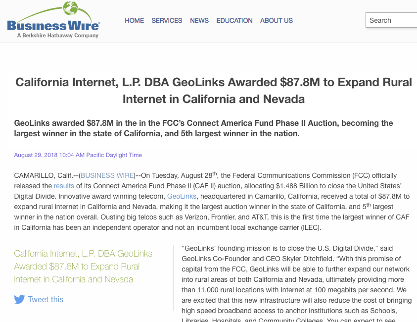 GeoLinks awarded $87.8M in the in the FCC’s Connect America Fund Phase II Auction, becoming the largest winner in the state of California, and 5th largest winner in the nation. August 29, 2018 10:04 AM Pacific Daylight Time CAMARILLO, Calif.–(BUSINESS WIRE)–On Tuesday, August 28th, the Federal Communications Commission […]