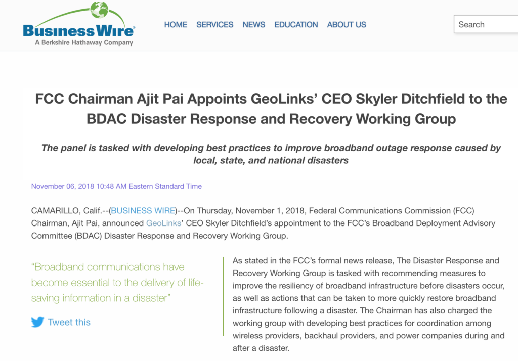 The panel is tasked with developing best practices to improve broadband outage response caused by local, state, and national disasters November 06, 2018 – Read Release on BusinessWire.com CAMARILLO, Calif.–(BUSINESS WIRE)–On Thursday, November 1, 2018, Federal Communications Commission (FCC) Chairman, Ajit Pai, announced GeoLinks’ CEO Skyler Ditchfield’s appointment […]