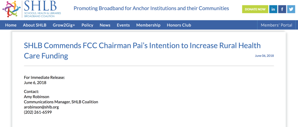 SHLB Commends FCC Chairman Pai’s Intention to Increase Rural Health Care Funding June 06, 2018 For Immediate Release: June 6, 2018 Contact: Amy Robinson Communications Manager, SHLB Coalition arobinson@shlb.org (202) 261-6599 Washington, DC (June 6, 2018) – The Federal Communications Commission (FCC) Chairman Ajit Pai circulated today a […]
