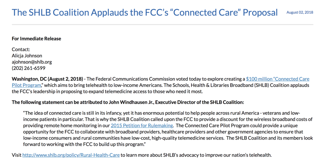 The SHLB Coalition Applauds the FCC’s “Connected Care” Proposal For Immediate Release Contact: Alicja Johnson ajohnson@shlb.org (202) 261-6599 Washington, DC (August 2, 2018) – The Federal Communications Commission voted today to explore creating a $100 million “Connected Care Pilot Program,” which aims to bring telehealth to low-income Americans. […]