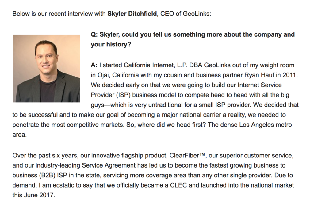 CEO Skyler Ditchfield’s Interview with SuperbCrew.com Founded in 2011, GeoLinks is the fastest growing B2B fixed wireless ISP in California. The company recently rebranded from California Internet to GeoLinks coinciding with its launch into the national market. GeoLinks offers unmatched speed to delivery and a wide range of […]