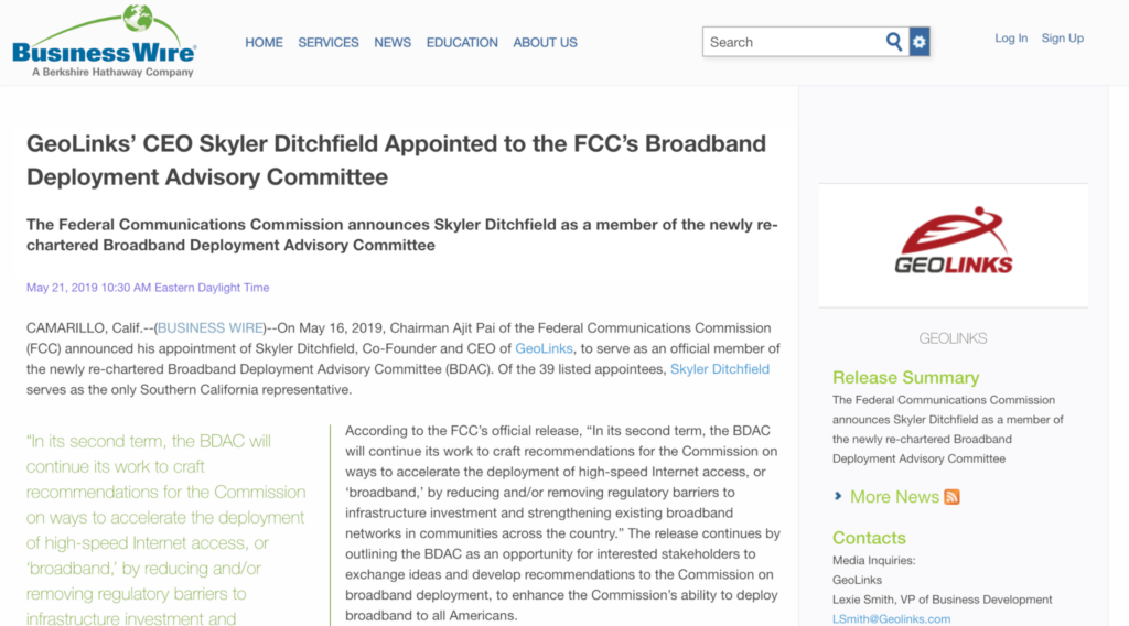 The Federal Communications Commission announces Skyler Ditchfield as a member of the newly re-chartered Broadband Deployment Advisory Committee May 21, 2019 10:30 AM Eastern Daylight Time: Original Release via BusinessWire CAMARILLO, Calif.–(BUSINESS WIRE)–On May 16, 2019, Chairman Ajit Pai of the Federal Communications Commission (FCC) announced his appointment […]