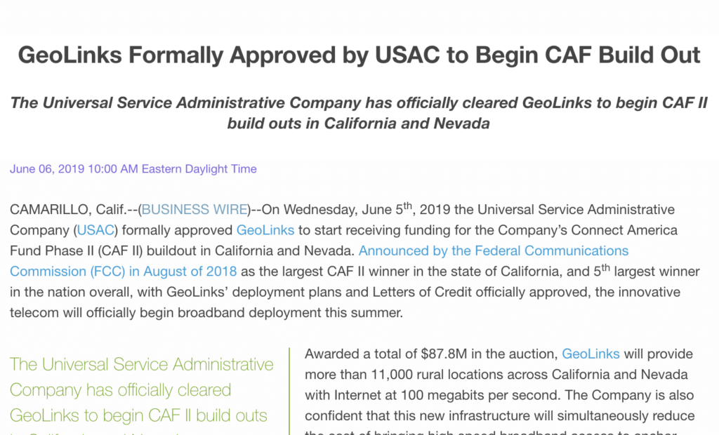 The Universal Service Administrative Company has officially cleared GeoLinks to begin CAF II build outs in California and Nevada June 06, 2019 10:00 AM Eastern Daylight Time: Original Release Here CAMARILLO, Calif.–(BUSINESS WIRE)–On Wednesday, June 5th, 2019 the Universal Service Administrative Company (USAC) formally approved GeoLinks to start […]