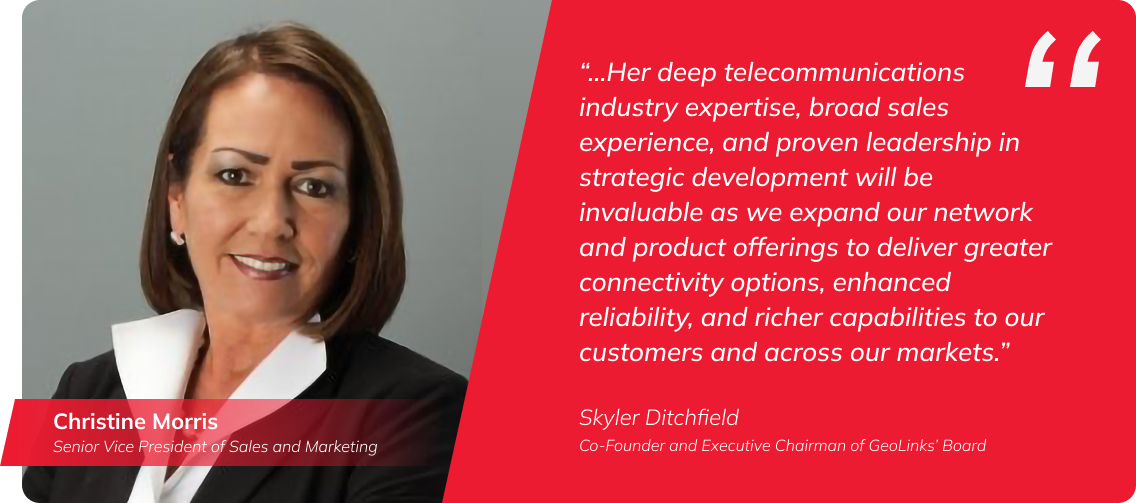 “GeoLinks is pleased to welcome Christine to this crucial role. Her deep telecommunications industry expertise, broad sales experience, and proven leadership in strategic development will be invaluable as we expand our network and product offerings to deliver greater connectivity options, enhanced reliability, and richer capabilities to our customers and across our markets,” said Skyler Ditchfield, Co-Founder and Executive Chairman of GeoLinks’ Board. I am confident her expertise and strategic vision will drive even greater sales and marketing success.”