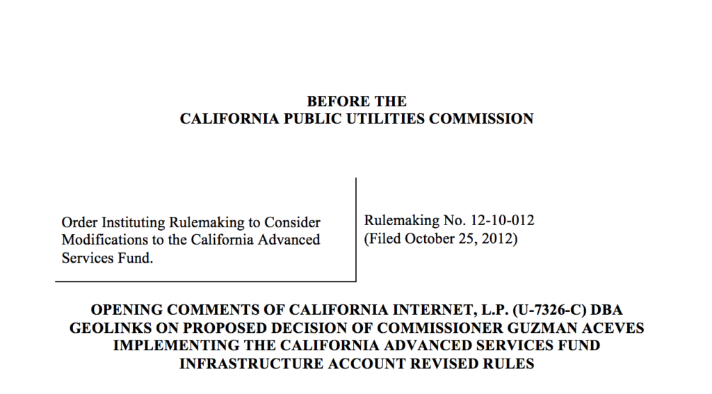 BEFORE THE CALIFORNIA PUBLIC UTILITIES COMMISSION Order Instituting Rulemaking to Consider Modifications to the California Advanced Services Fund. Rulemaking No. 12-10-012 (Filed October 25, 2012) OPENING COMMENTS OF CALIFORNIA INTERNET, L.P. (U-7326-C) DBA GEOLINKS ON PROPOSED DECISION OF COMMISSIONER GUZMAN ACEVES IMPLEMENTING THE CALIFORNIA ADVANCED SERVICES FUND INFRASTRUCTURE […]
